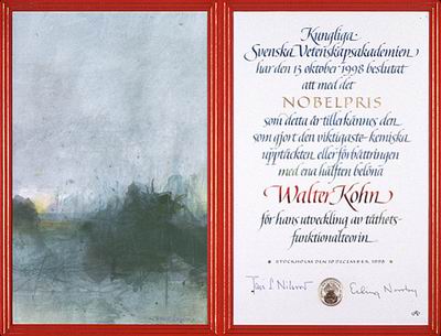 ![]() 1997 - Paul D. Boyer [U.S.A.] | ![]() 1997 - John E. Walker [U.K.] ![]() 1997 - Jens C. Skou [Denmark] ![]() 1998 - Walter Kohn [U.S.A.] ![]() 1998 - John A. Pople [U.S.A., U.K.] ![]() 1999 - Ahmed H. Zewail [U.S.A., Egypt] ![]() 2000 - Alan J. Heeger [U.S.A.] ![]() 2000 - Alan G. MacDiarmid [U.S.A.] ![]() 2000 - Hideki Shirakawa [Japan] ![]() 2001 - William S. Knowles [U.S.A.] ![]() 2001 - Ryogi Noyori [Japan] ![]() 2001 - K. Barry Sharpless [U.S.A.] ![]() 2002 - John B. Fenn [U.S.A.] ![]() 2002 - Koichi Tanaka [Japan] ![]() 2002 - Kurt Wuthrich [Switzerland] ![]() 2003 - Peter Agre [U.S.A.] ![]() 2002 - Roderick MacKinnon [U.S.A.]