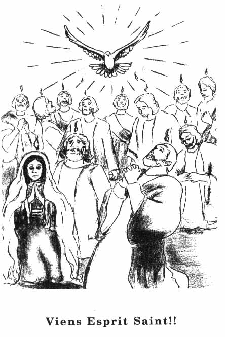 Les apôtres s'étaient tous réunis dans la Cénacle où ils priaient avec Marie. Soudain, il y eut un bruit qui venait du ciel comme celui d'un violent coup de vent. Alors leur apparurent comme des langues de feu qui se partageaient et il s'en posa sur chacun d'eux. Ils furent tous remplis du St. Esprit. «Je crois en Dieu, le Père tout-puissant, créateur du ciel et de la terre. Et en Jésus Christ, son Fils unique, notre Seigneur, qui a été conçu du St. Esprit, est né de la Vierge Marie, a souffert sous Ponce Pilate, a été crucifié est mort et a été enseveli, est descendu aux enfers, le troisième jour est ressuscité des morts, est monté aux cieux, est assis à la droite de Dieu le Père toutpuissant d'où Il viendra juger les vivants et les morts ... Je crois en l'Esprit St., à la sainte Église catholique, à la communion des saints, à la rémission des péchés, à la résurrection de la chair, à la vie éternelle». Amen |